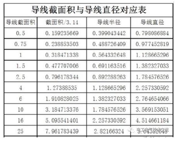 如测得导线直径为1.78mm,半径则为1.78/2=0.89mm,套入公式后S=3.14×(0.89×0.89)=2.487194,该导线横截面积就是国标2.5mm²。可以参照下表: